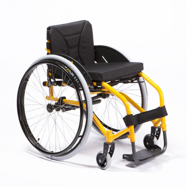 Вместо подлокотников на коляску для активных пользователей устанавливаются защитные щитки. Цельная подножка легко снимается и регулируется по высоте. Угол наклона колеса оговаривается при заказе и может быть 4°, 6°, 8°, 10°.